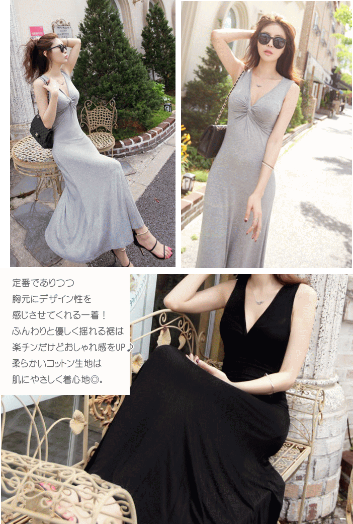 ワンピース マキシ丈ワンピース ロングワンピース ノースリーブ Vネック 無地 Aライン 胸元ツイスト コットン レディース