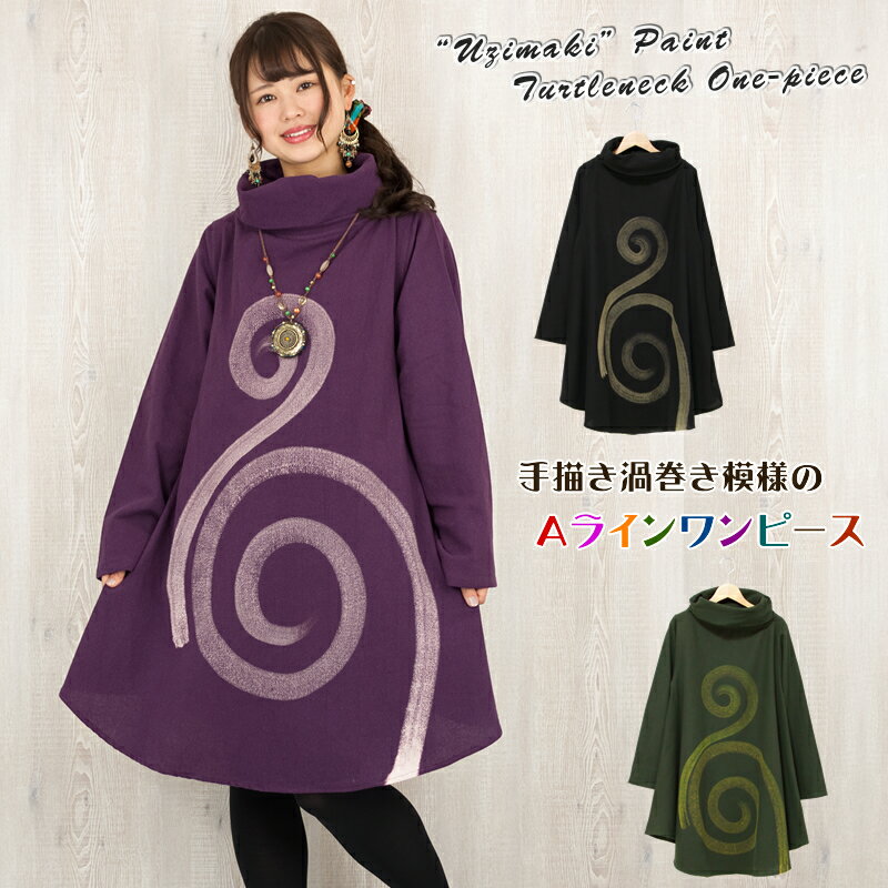■サイズ 肩幅38cm、胸囲105cm、袖丈55cm、着丈90cm裾幅120cm、袖ぐり50cm■写真モデル 身長157cm(パープル着用)、160cm(グリーン着用)■材質 コットン■生産国 タイ■フロントの筆タッチの渦巻きペイントがエスニック感あふれるタートルネックワンピースです。