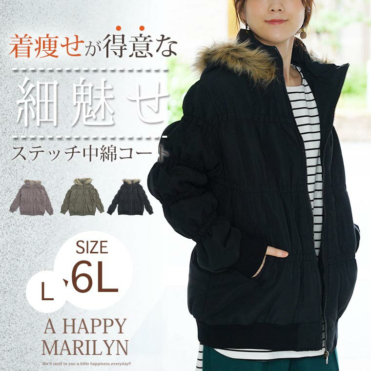 大きいサイズ レディース アウター | リニューアル!! 細魅せ ステッチ ファーフード付き 長袖 中綿 ロングコート _ フーディー エコファー LL 3L 4L 5L 6L 冬 冬物 冬服 ぽっちゃり ゆったり プラスサイズ あったか 暖かい 防寒 [856827]