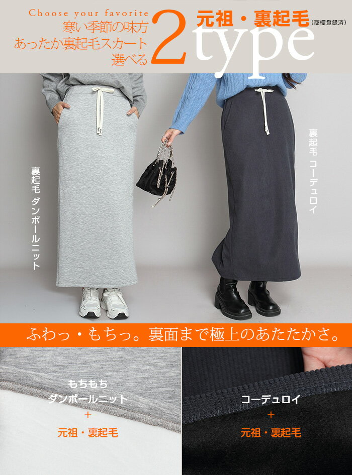 ついに!裏起毛シリーズにスカートタイプが登場!人気のヒミツは他店とは違う、ミンク風裏起毛!低身長さんに嬉しい短めサイズもあり!ワンマイルウェアとしても