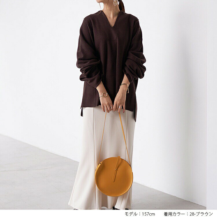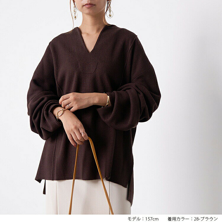 ドロップショルダーやボリューム袖のゆったりとしたシルエットで華奢見えも叶えます。首元や顔周りをすっきりと見せてくれるキーネックもポイント。一枚で決まるデザイン。