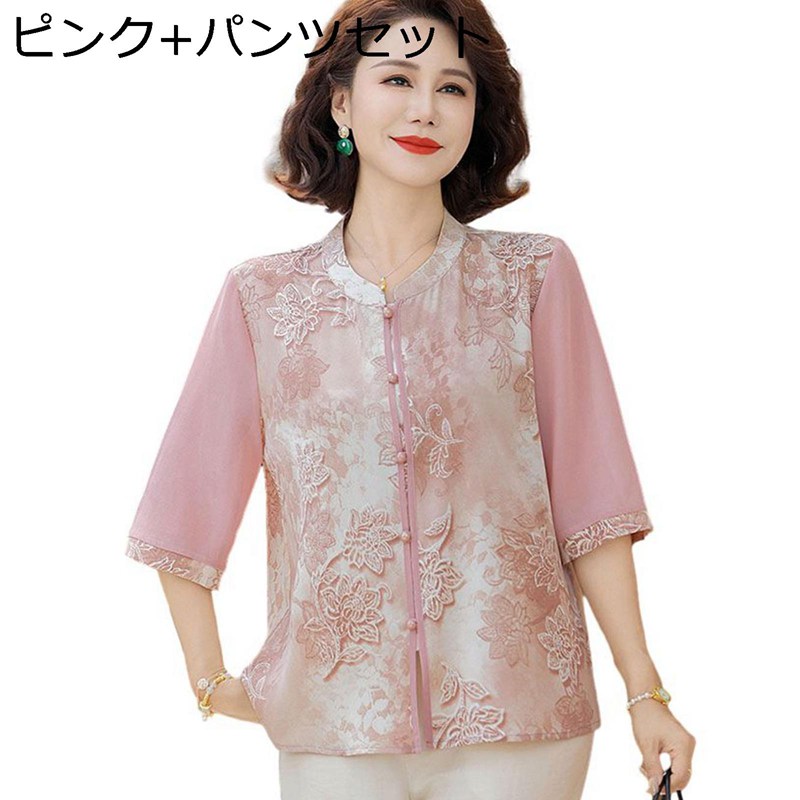 花柄 シャツ レディース セットアップ 春夏着 女性 高齢者 クルーネック 半袖 ブラウス チュニック お年寄り 中高年 ゆったり 通気性 シニアファッション 老人服 母の日 敬老 60代 70代 80代