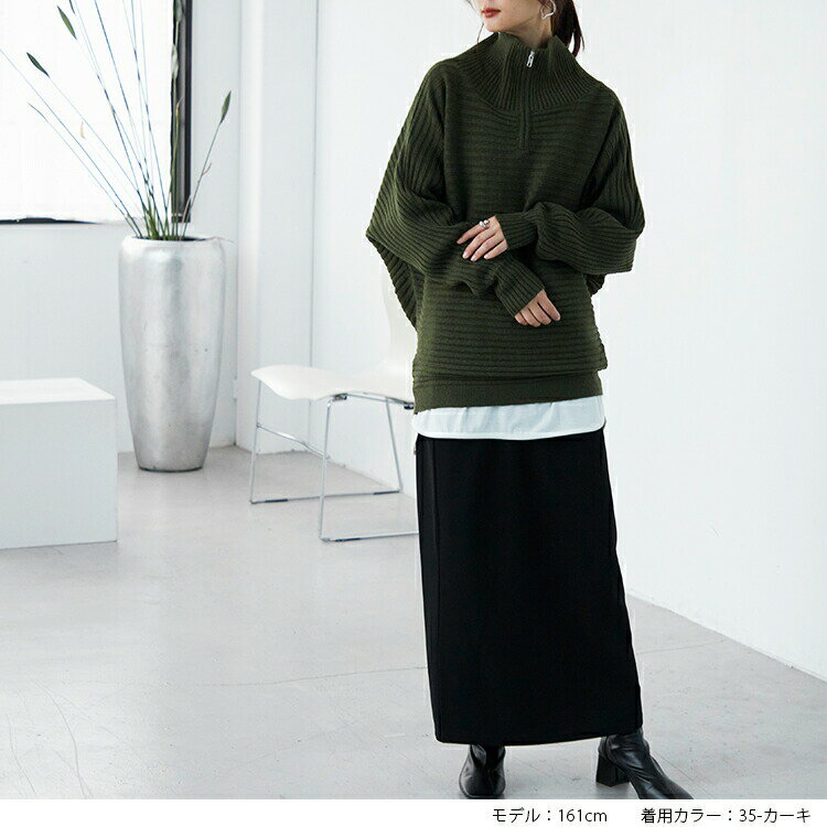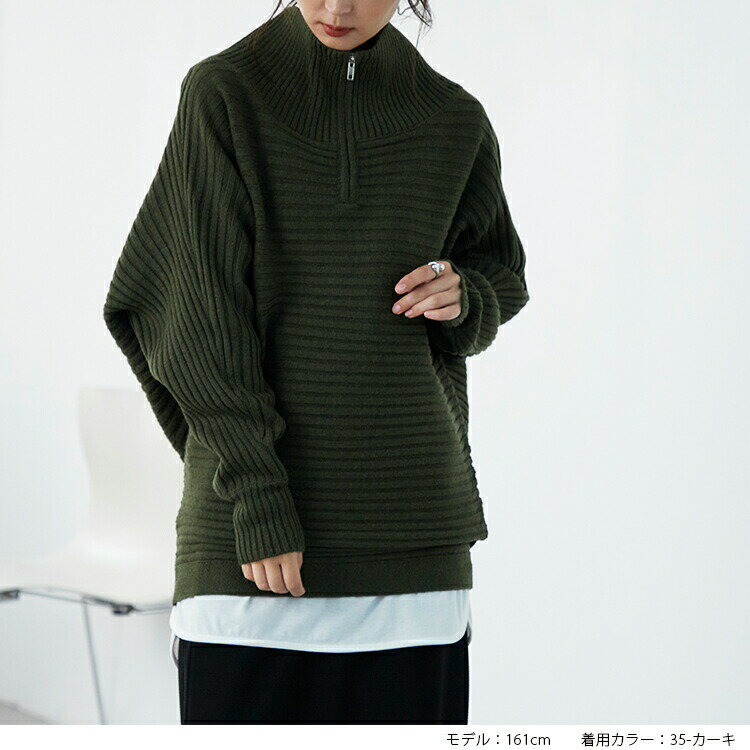アウター無しでもさまになるハーフジップデザイン。ドルマンシルエットでストレスフリーな着心地。非ウールのためチクチクとせずニットが苦手な方にもオススメ。