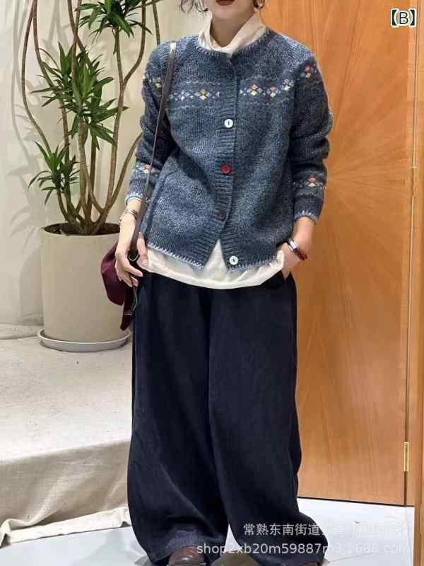 カーディガン レディース レトロ アーガイル柄 ミックスカラー ニット トップス コットン 長袖 丸首 普段使い かわいい 大人女子 清新 秋冬(x2)