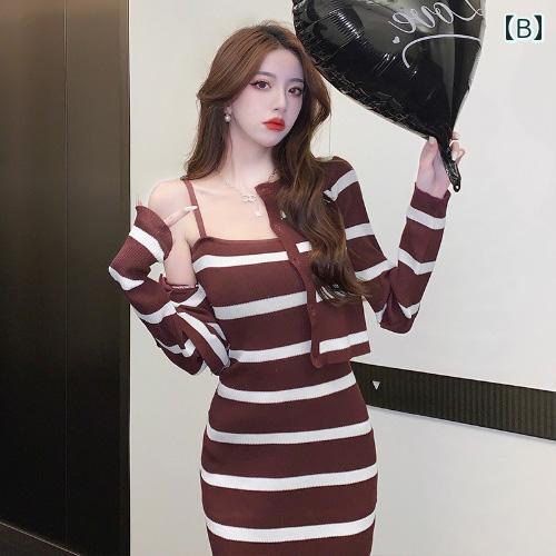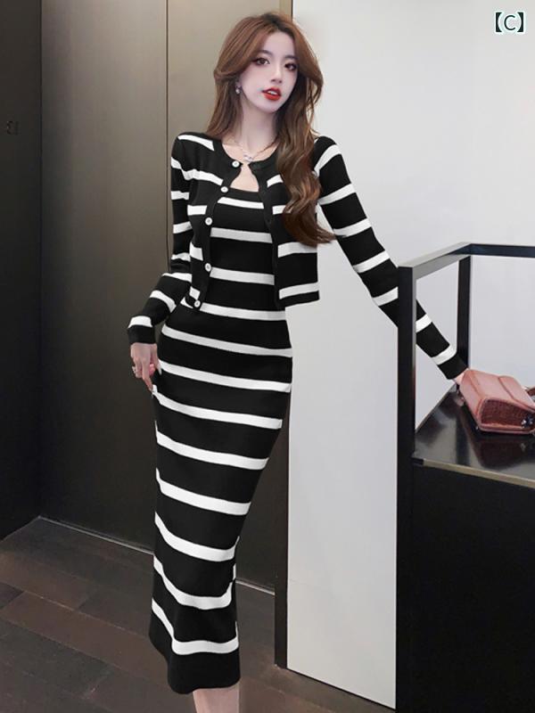 セットアップ レディース カジュアル おしゃれ デート 女子会 ソルト 系 軽やか 大人っぽい フェミニン お姫様 系 バッグ ヒップ ドレス 秋 黒 ニット トップス 2点 セット