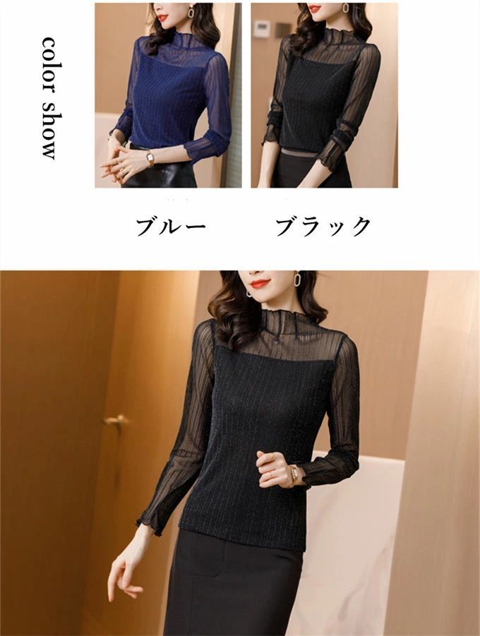 Tシャツ シースルー レイヤード インナー チュール かわいい 重ね着 長袖 きれいめ ファッション ハイネック コーデ 冬 キラキラ 薄手 オフィスカジュアル エレガント セクシー セクシー レディース 透け感 秋 シアース 厚手 春