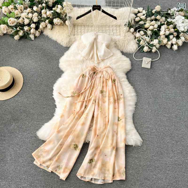 セットアップ レディース 夏 リゾート 旅行 若見え ホルターネック ベアトップ トップス レトロ柄 ワイドパンツ 着回し トレンド シェニール ストレッチ