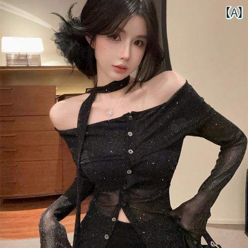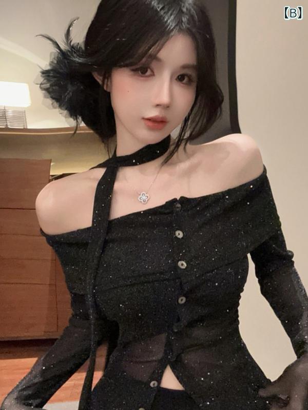 春 コーデ レディース ファッション オシャレ カワイイ シンプル きれいめ ナチュラル 上品カジュアル 婦人服 ハイエンド 光沢 黒 レイヤリング シャツ スリム トップス T