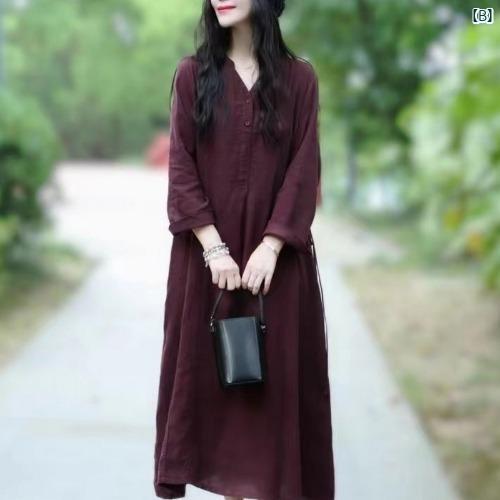 レディース ファッション コーデ 春 夏 秋 秋新 砂 リネン ドレス 文学 ベルト Vネック スリム ローブ 膝上