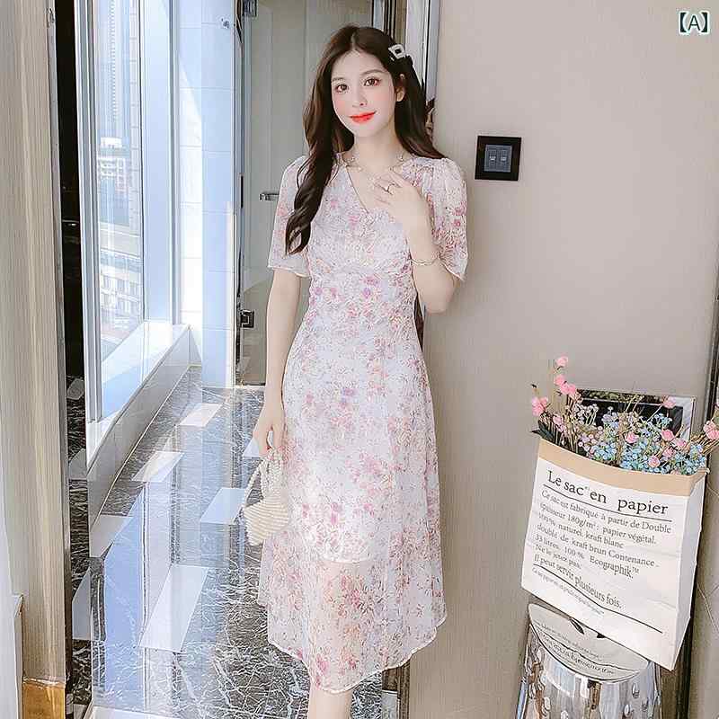 レディース ファッション 服 オシャレ カワイイ 女性用 シンプル 大人カワイイ 大きいサイズ 婦人服 夏 スリム シフォン 半袖 花柄 ドレス