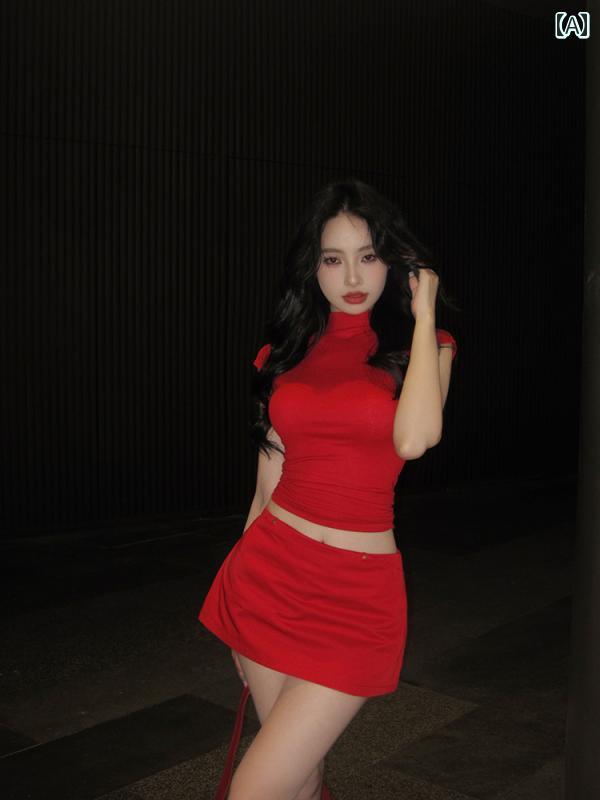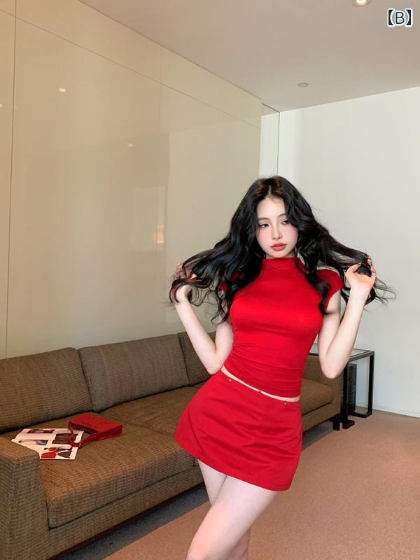 春 コーデ レディース ファッション オシャレ カワイイ シンプル きれいめ ナチュラル 上品カジュアル 婦人服 スリム 半袖 タイト Tシャツ トップス 赤 スカート スーツ