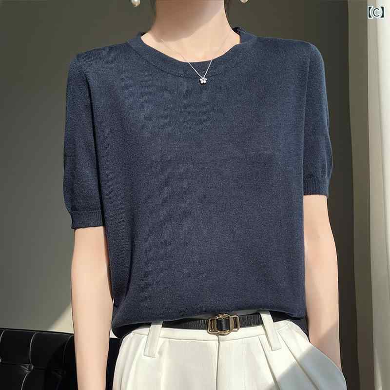 レディース トップス シンプル おしゃれ 春夏 ウール セーター ラウンドネック 半袖 ゆったり スリム 薄手 涼しい 涼しい 半袖 Tシャツ ニット セーター 秋