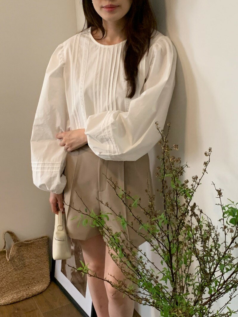 早春新作 韓国ファッション ゆったり ラウンドネック プリーツ フリル ランタンスリーブ ショート丈 シャツ レディースファッション