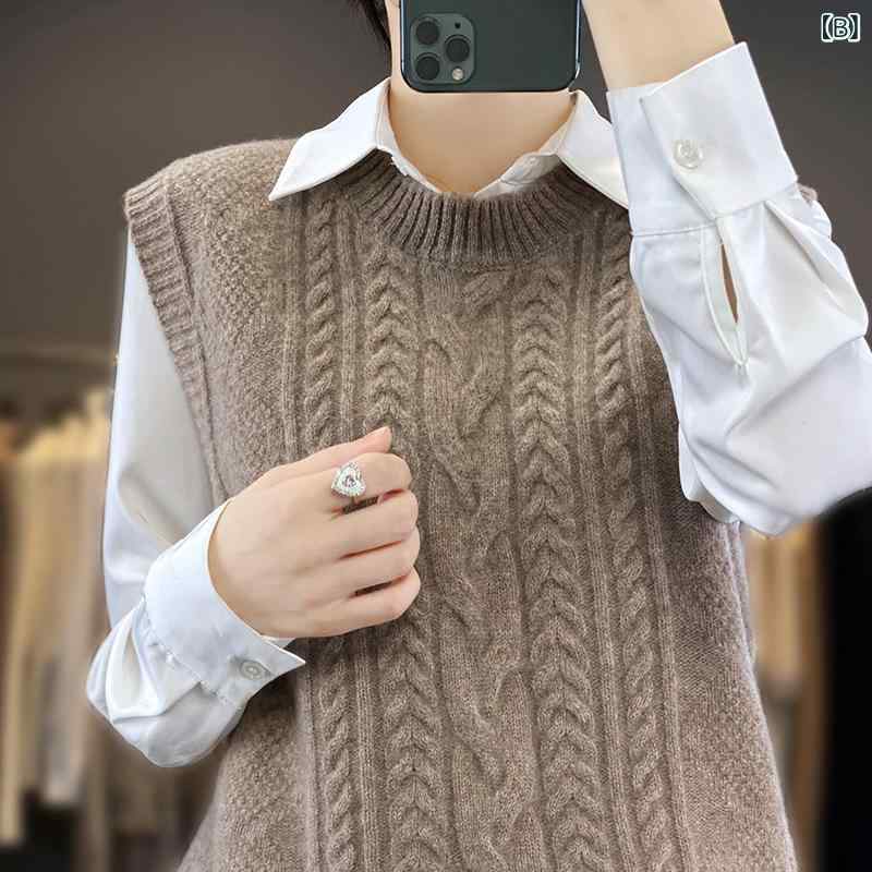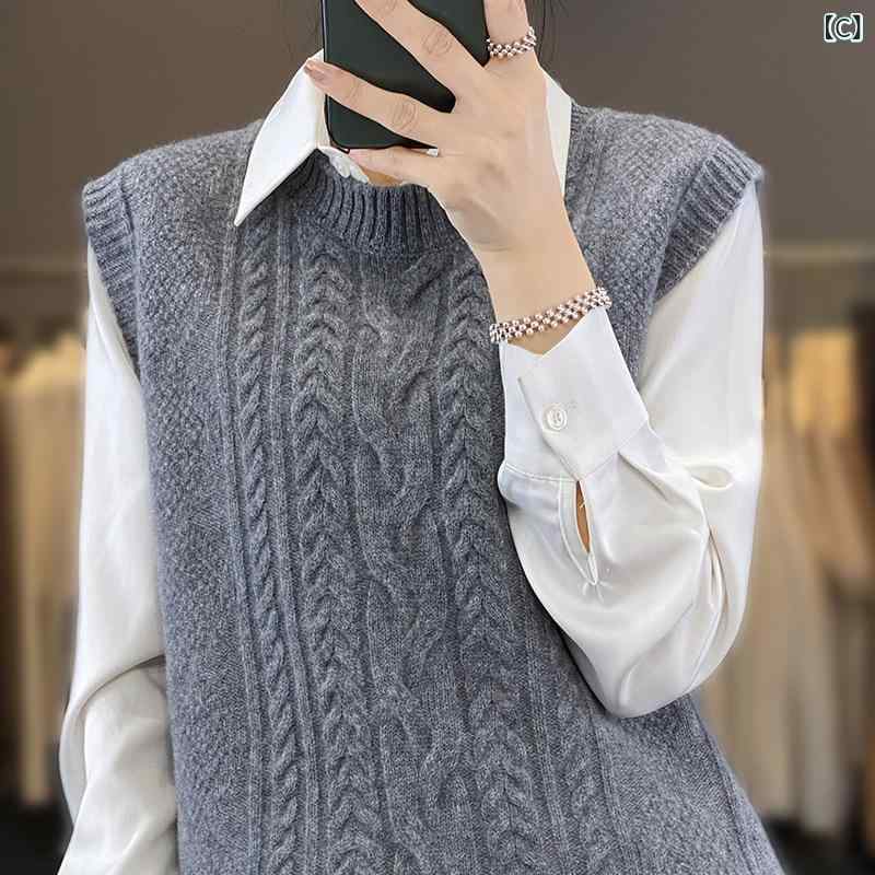 ニットベスト レディース 秋冬 羊毛 ゆったり オーバーサイズ ノースリーブ クルーネック 肉厚 ケーブル編み リブ編み ショート丈 デザイン性 カジュアル