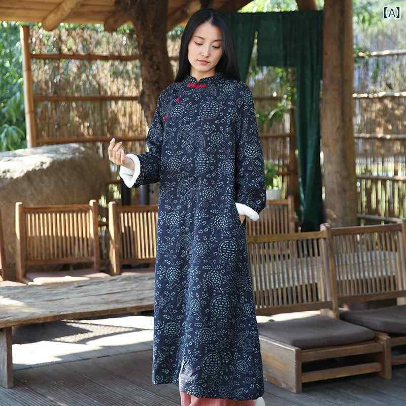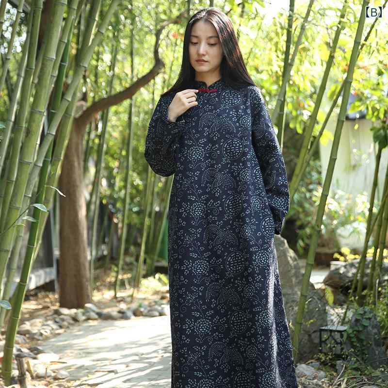 チャイナドレス エスニック ビッグシルエット スリム見え レディース 春 長袖 中国 民族衣装 韓服 花 ティーブレイク スタンドカラー Aライン ロング