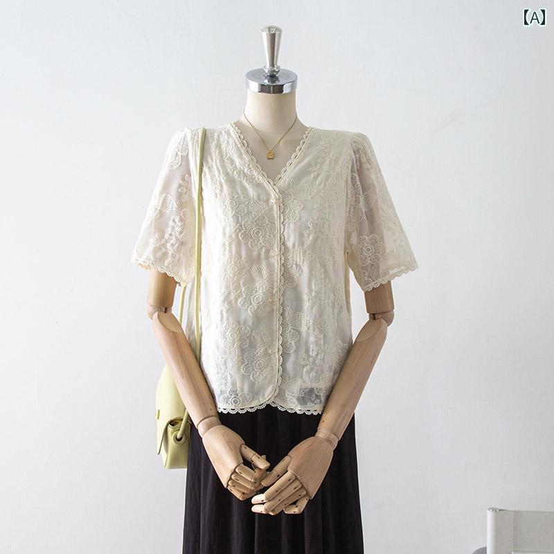 トップスレディース 半袖 Vネック 花柄 レース フリル 刺繍 ゆったり ショート 上品 大人 可愛い 春夏