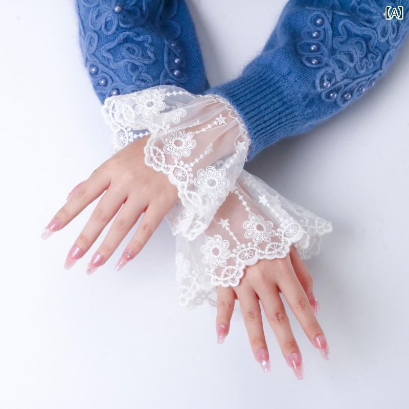付け袖 レディース エレガント プリーツ チュール レース アームカバー フェイク袖 上品 クラシカル ファッション小物 レイヤード 透け感 コットン ホワイト 秋冬