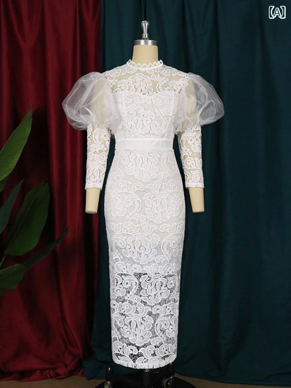 パーティードレス レディース レース 透け感 パフスリーブ 七分袖 スリム タイト ワンピース ポリエステル ホワイト ピンク 高腰 膝丈 ミディ丈 エレガント 通勤 パーティー