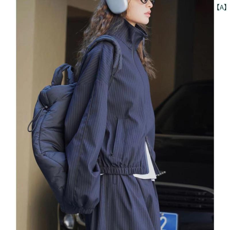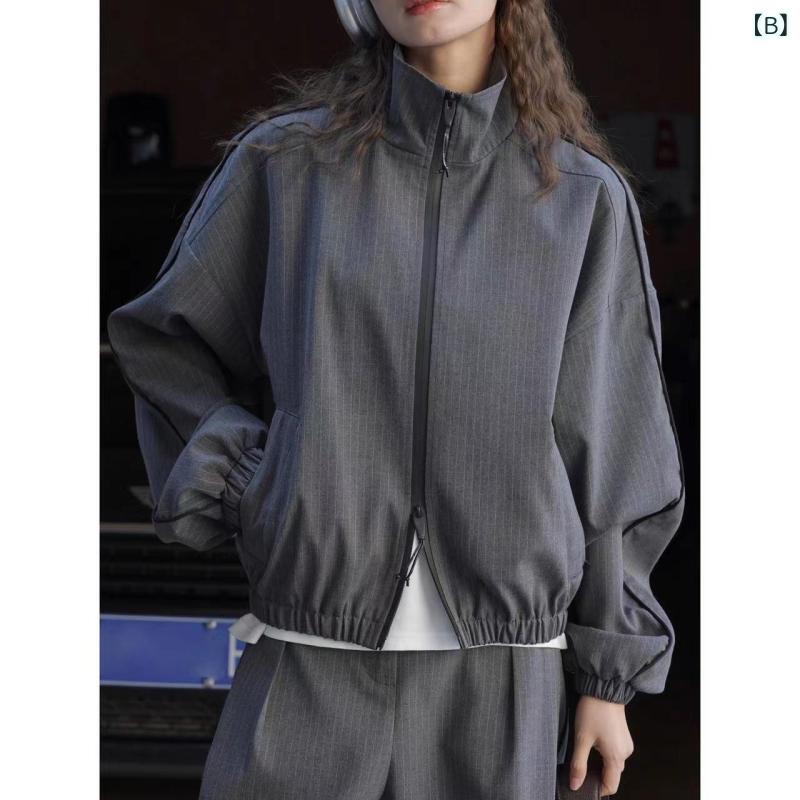ジャケット レディース 春秋 ストライプ柄 TR素材 立襟 普段使い 韓国 紺色 グレー