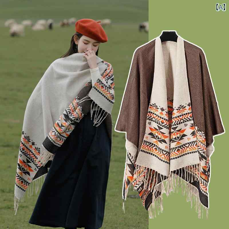 ショール レディース ストール ポンチョ風 大判 秋冬 あったか 民族風 幾何学模様 フリンジ 旅行 ブランケット ひざ掛け 羽織もの 防寒 冷房対策 春夏