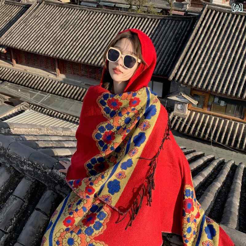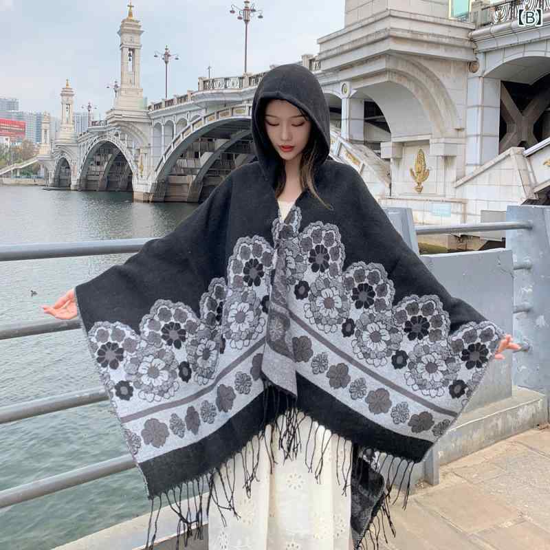ポンチョ レディース ケープ フード付き 花柄 ジャカード織り スリット フリンジ 保温 あったか カシミヤタッチ レッド ブラック キャメル オレンジ ネイビー ローズ 旅行 撮影 フォトジェニック 大人かわいい