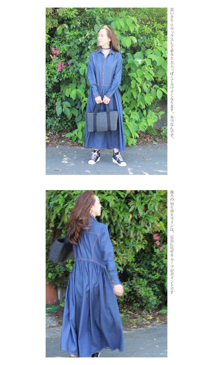 オレンジステッチの切替が可愛いデニムワンピース 美スタイル設計にこだわりました