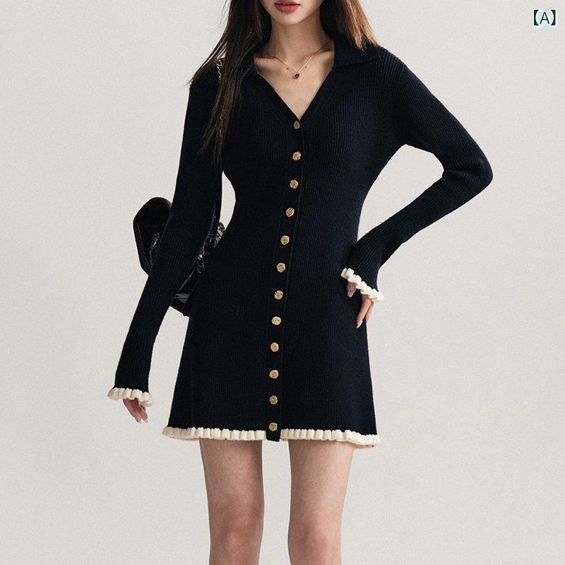ワンピース レディース Vネック Aライン ニットワンピース 長袖 ミニワンピース 高腰 ギャザー フリル ブラック 黒 春秋 エレガント 通勤 普段使い