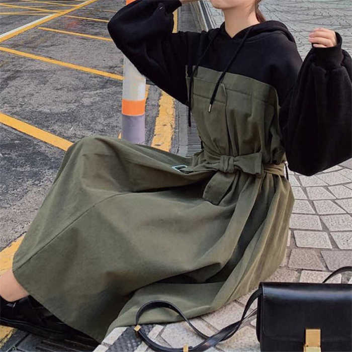【送料無料◎宅配便発送】ワンピース パーカーワンピース ワンピ 春 秋 レディース フェイクレイヤード 厚手 フード付き リボン ボウタイ ゆったり バルーン袖 綿 コットン 無地 長袖