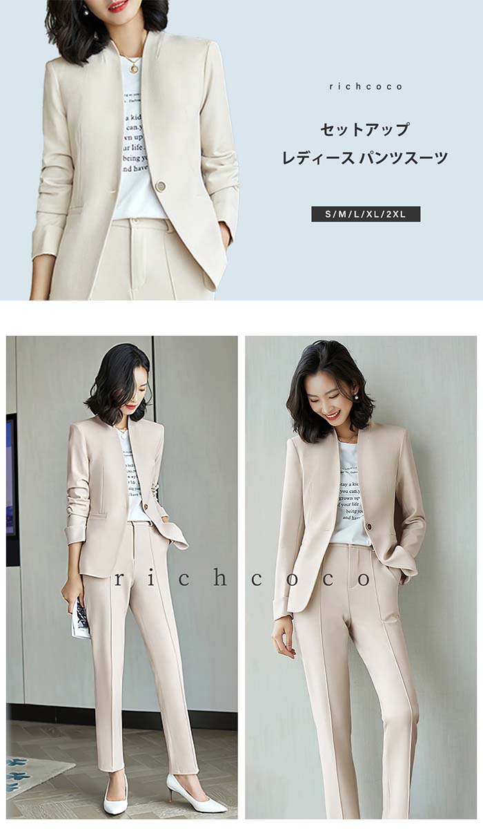 商品名 スーツセットアップpp-kyo01 この商品について ジャケット+パンツのパンツスーツ2点セットスーツ。ジャケットは羽織るだけでおしゃれなスーツスタイルが完成するノーカラージャケット。脚をキレイに魅せるテーパードアンクルパンツは動き易く、細すぎず太過ぎないシルエットは流行に左右されません。オールシーズンご着用いただけるようパンツは裏地無し、ジャケットは総裏仕様にしております。 ジャケットの...