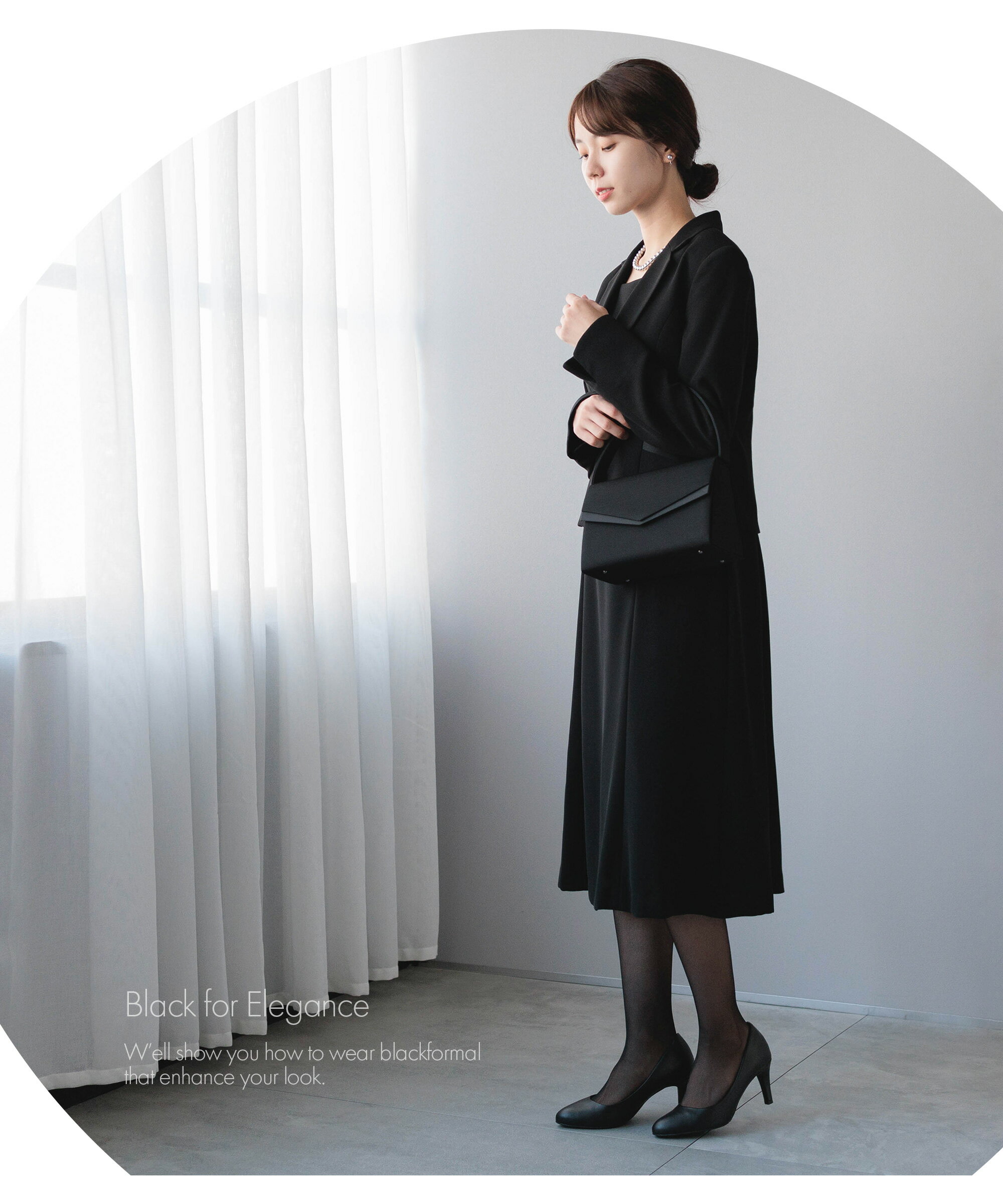 セミフレアラインのワンピースと相まって、柔らかなシルエットのブラックフォーマルアンサンブル。襟に滑らかなカーブを施したテーラードジャケットが上品さを際立たせてくれます。